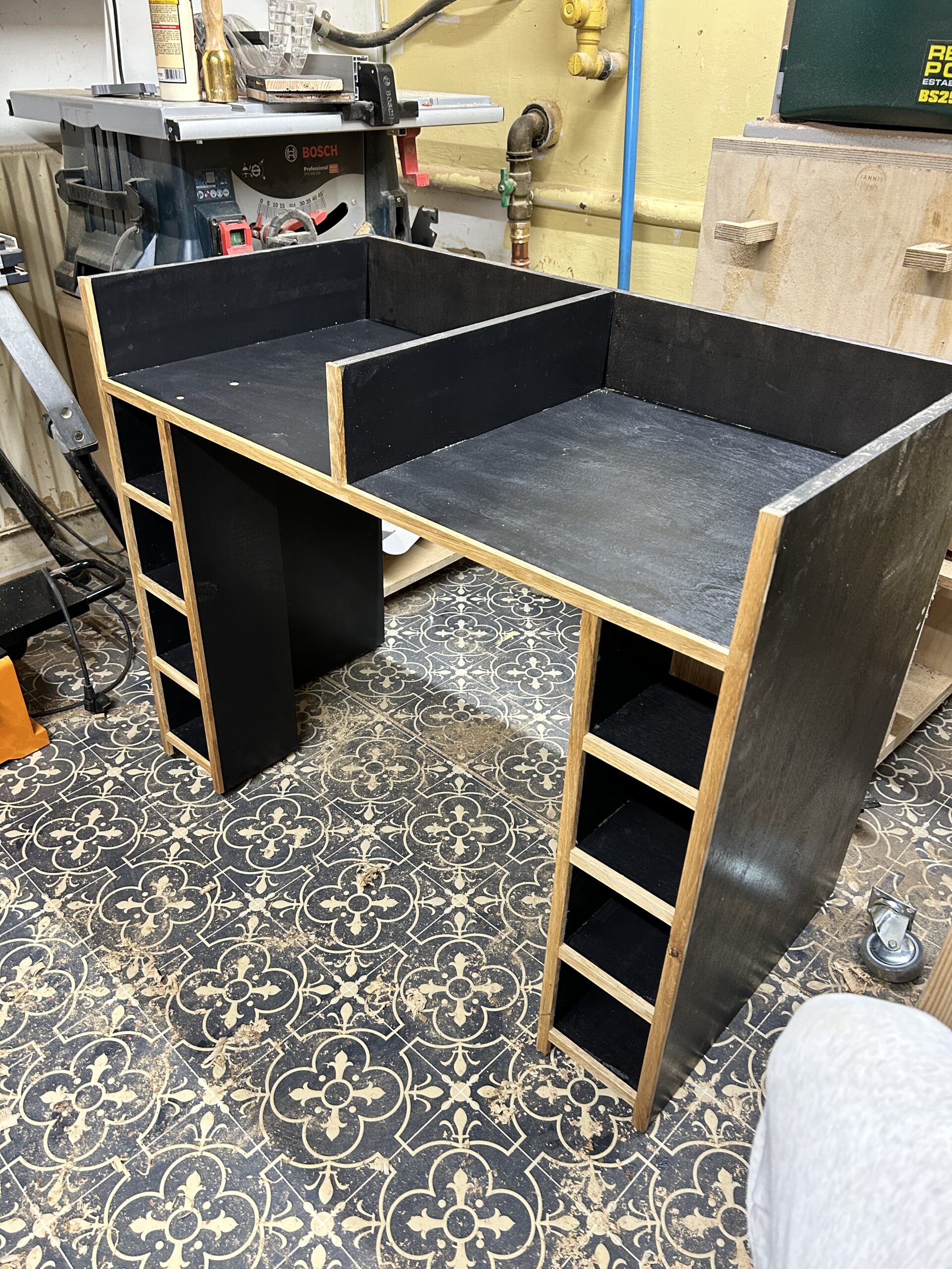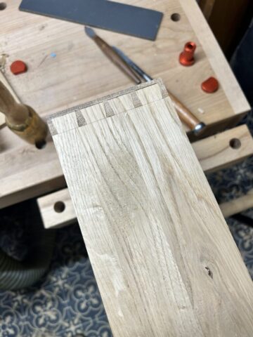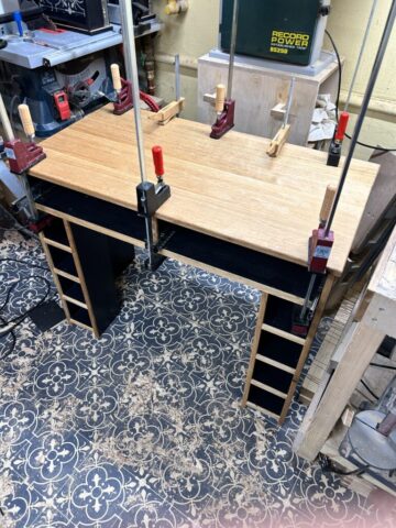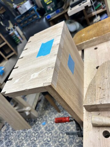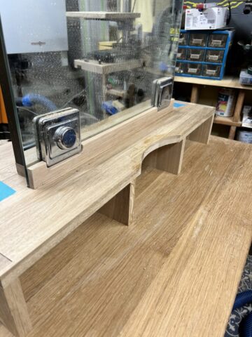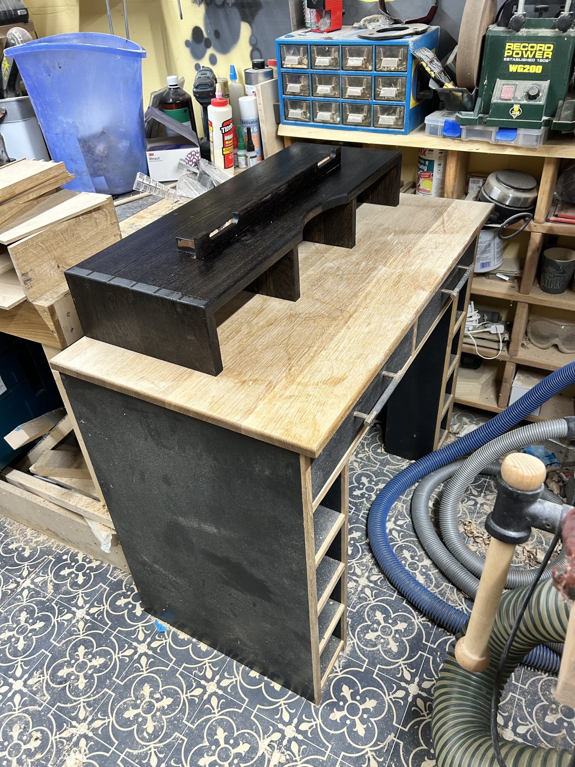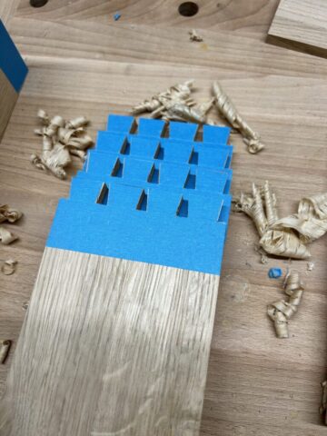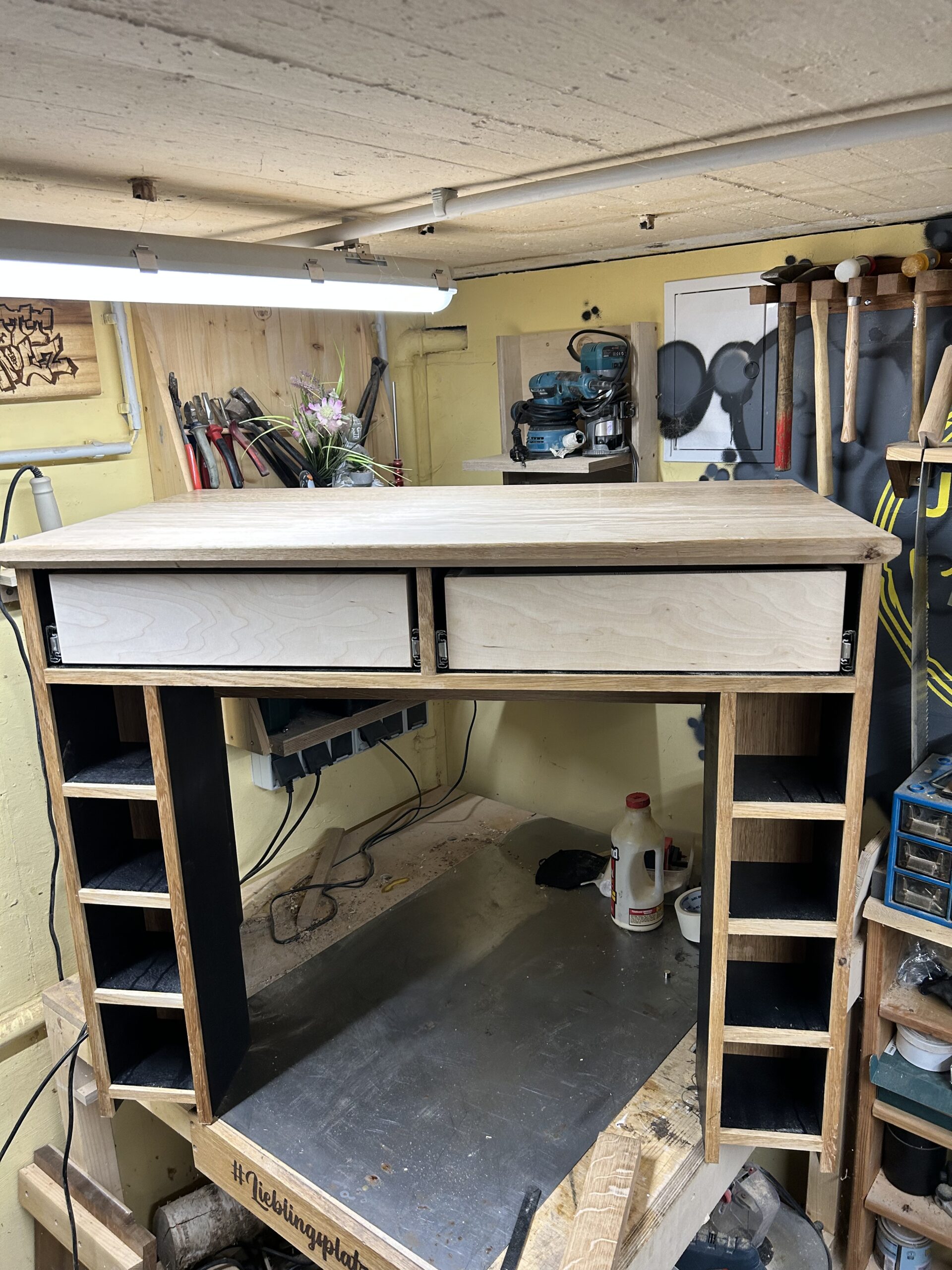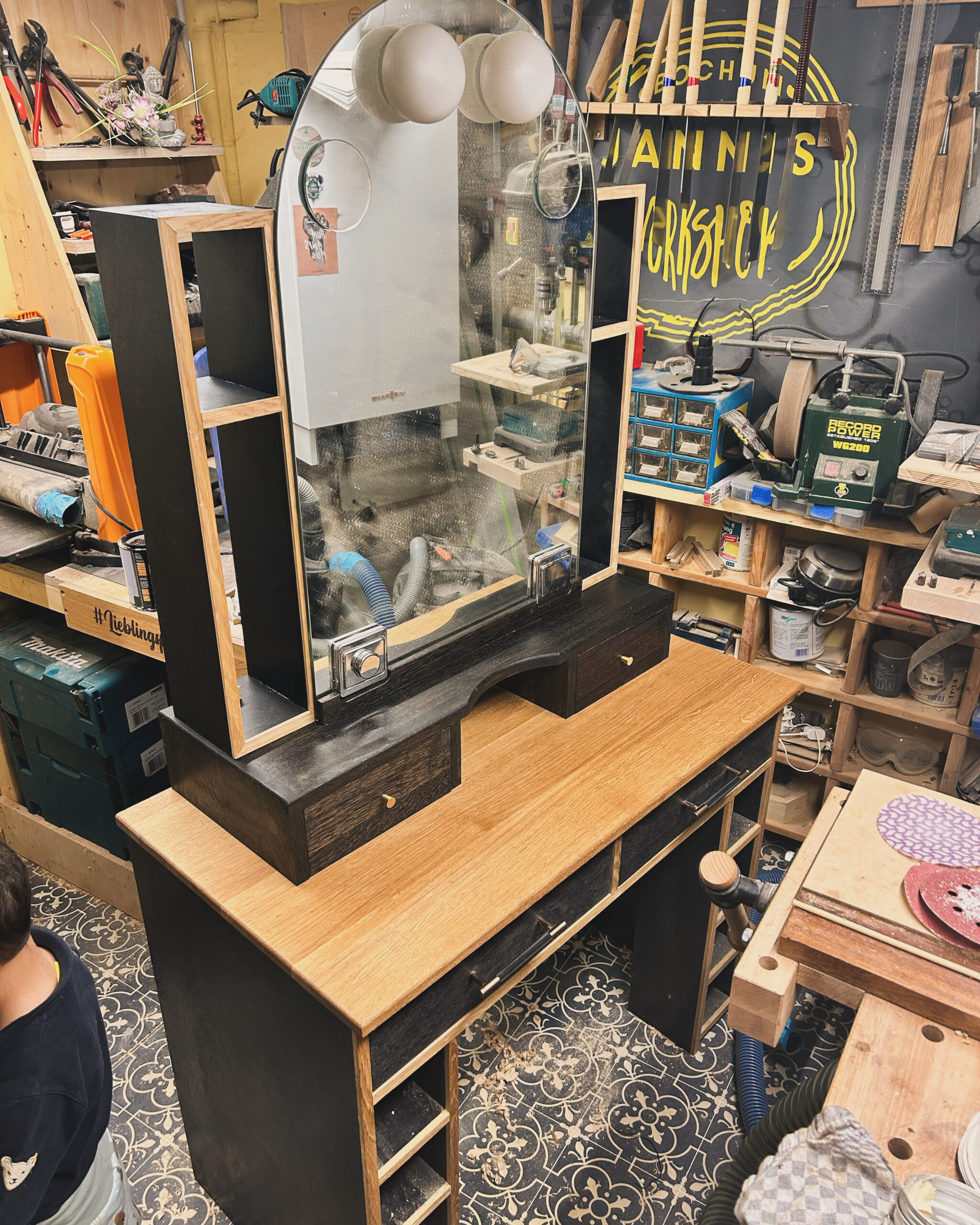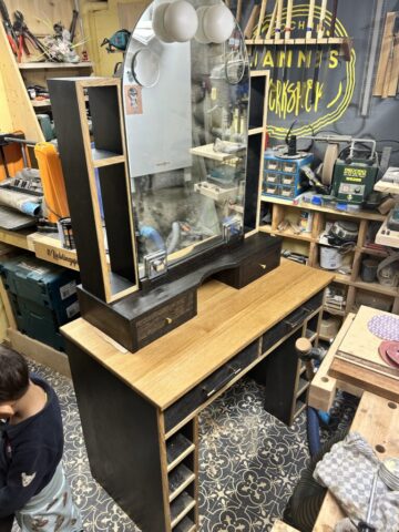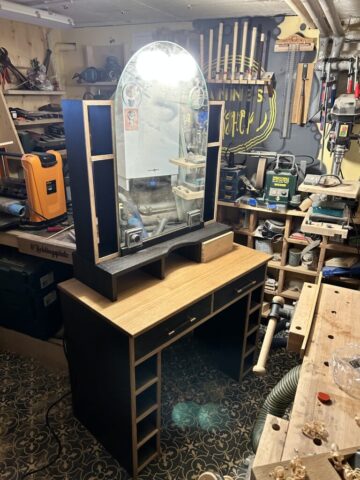 Das Projekt habe ich 2024 für meine Frau gebaut. Der Schminktisch besteht aus Plattenmaterial mit Eiche-Anleimern und in großen Teilen Eiche-Massivholz. Die Eiche habe ich Schwarz eingefärbt (Mit Hilfe von Oxidation – Essig-Metal Gemisch). Viele der Holzverbindungen sind Dovetails. Der Spiegel konnte aus dem Badezimmer meiner Großeltern wiederverwendet werden, was den Tisch für mich nochmal ganz besonders macht.