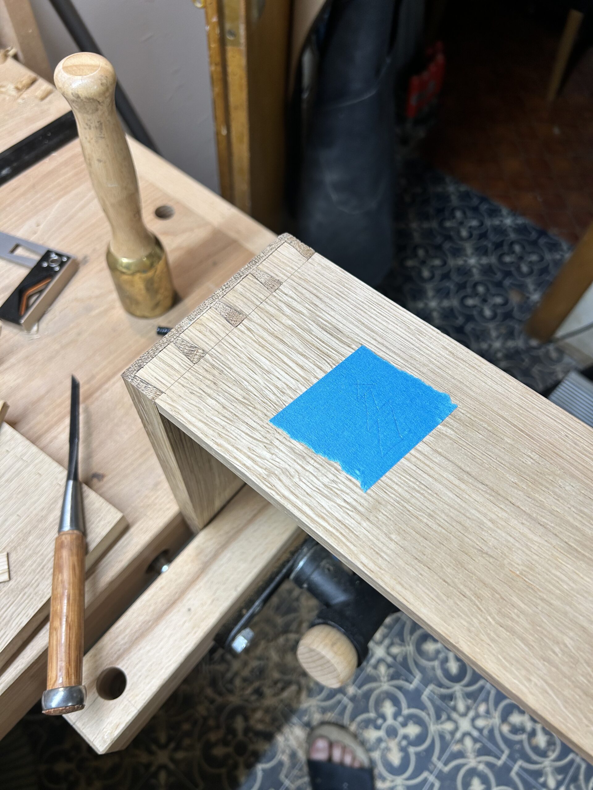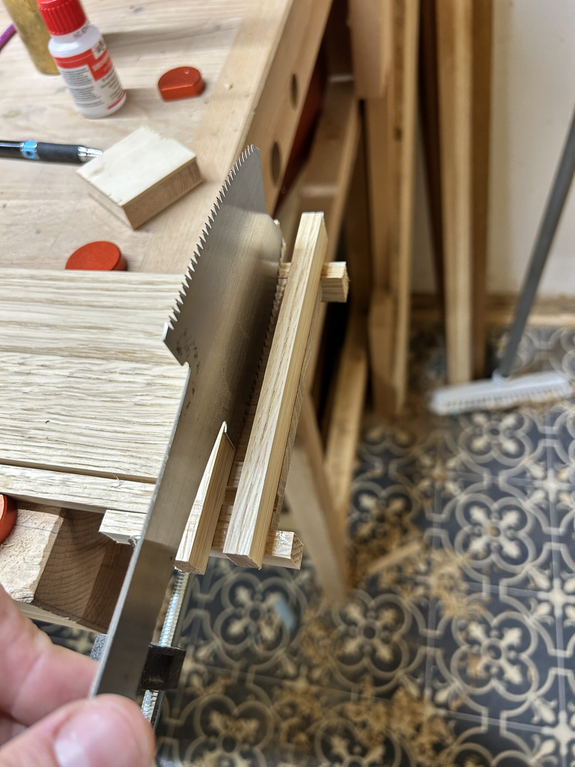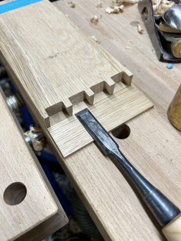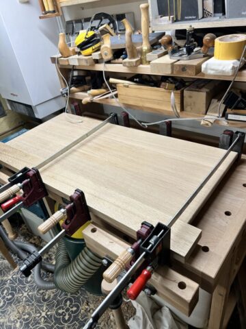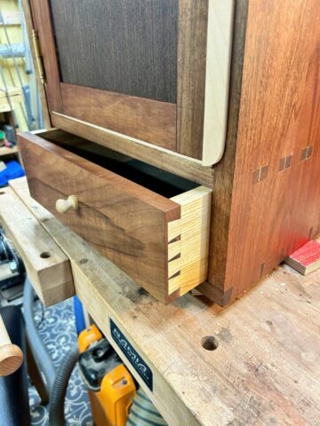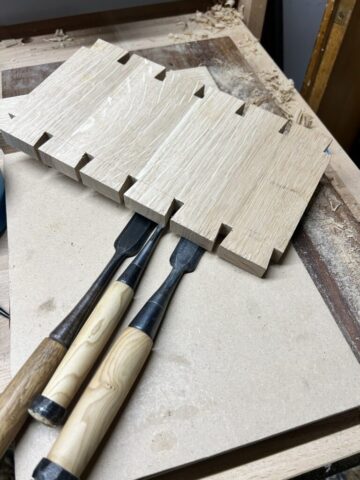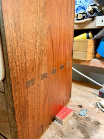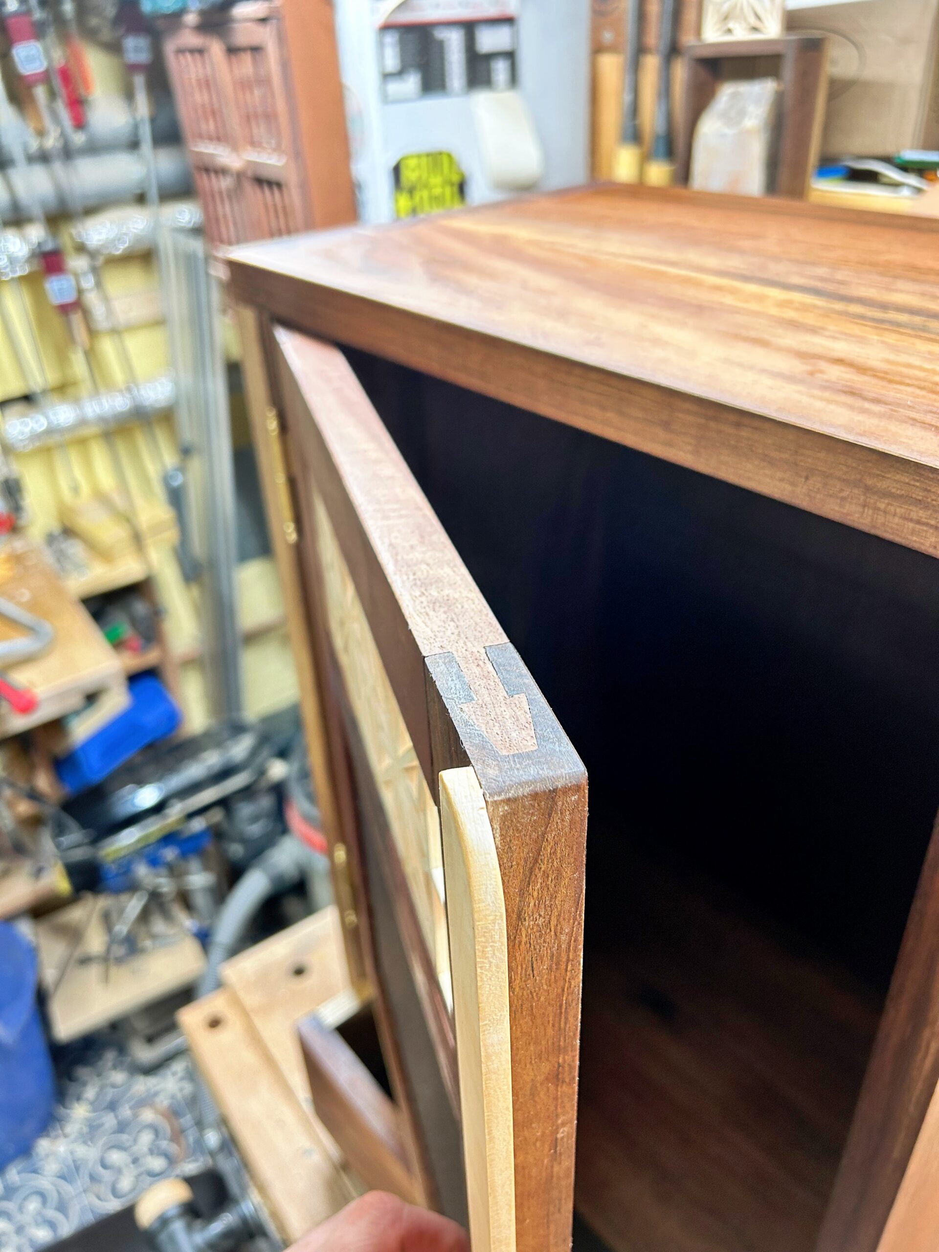 Ich habe Kumiko für die Füllung der Tür benutzt. Für die größeren Flächen (Schrank Rückwand und die Tür) habe ich Multiplex furniert. Es kam dabei das Saraifo Furnier zum Einsatz. Der Korpus wurde mit Schwalbenschwanzverbindungen versehen und die Tür mit Schlitz und Zapfen. Als kleines Gimmick habe ich auch eine japanische Verbindung hergestellt mit dem Namen “kama hozo kumi”. Dazu wurde ich von Dorian Bracht und seinem Buch inspiriert.