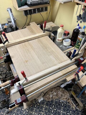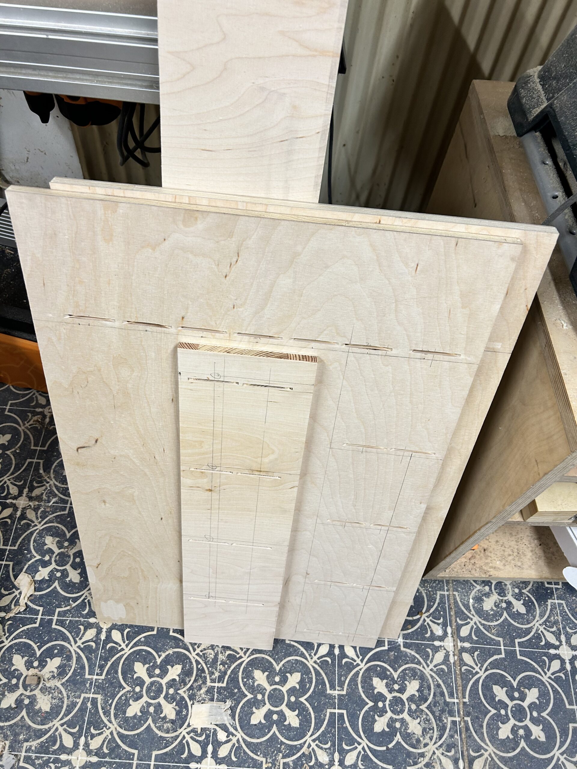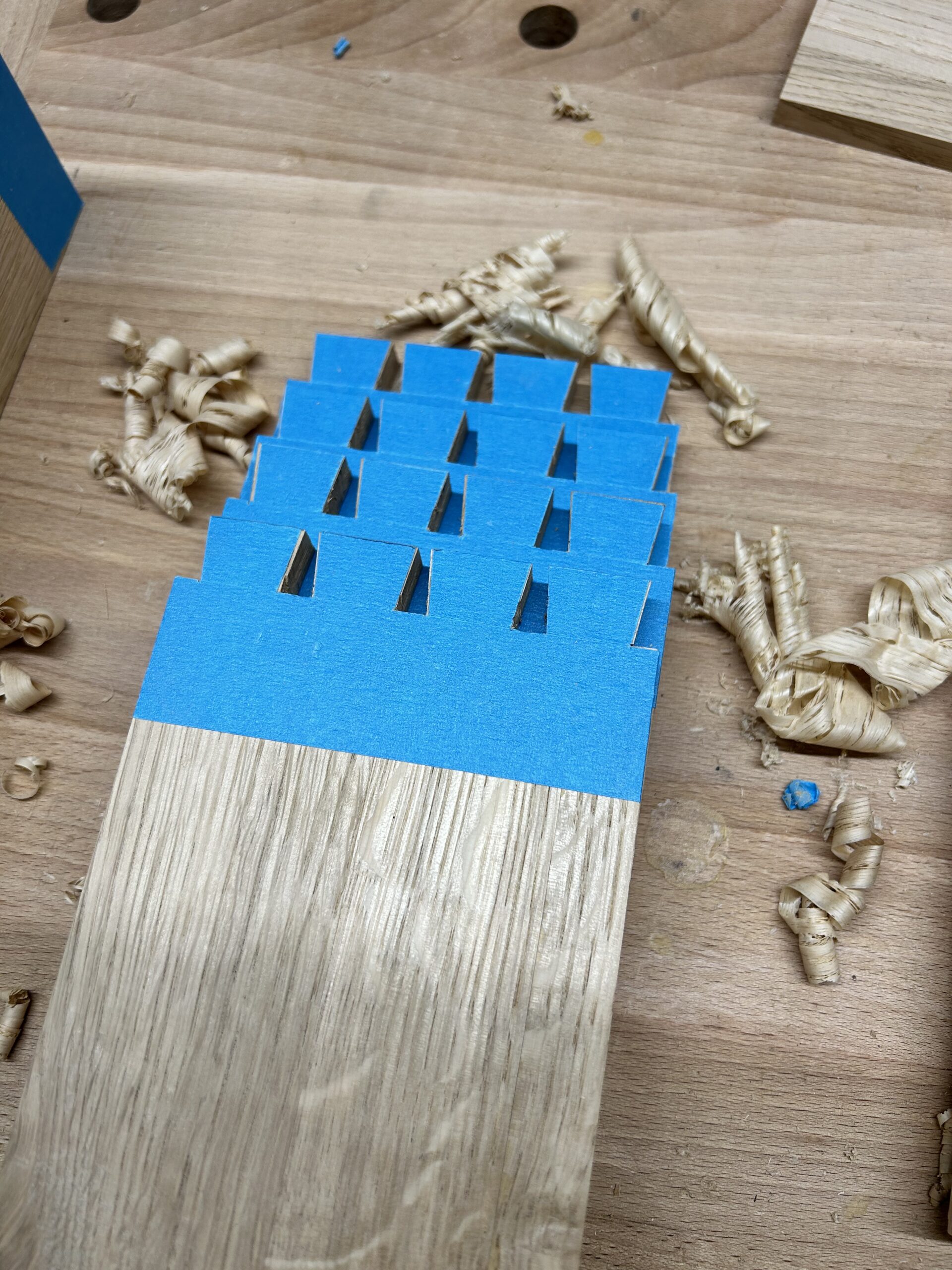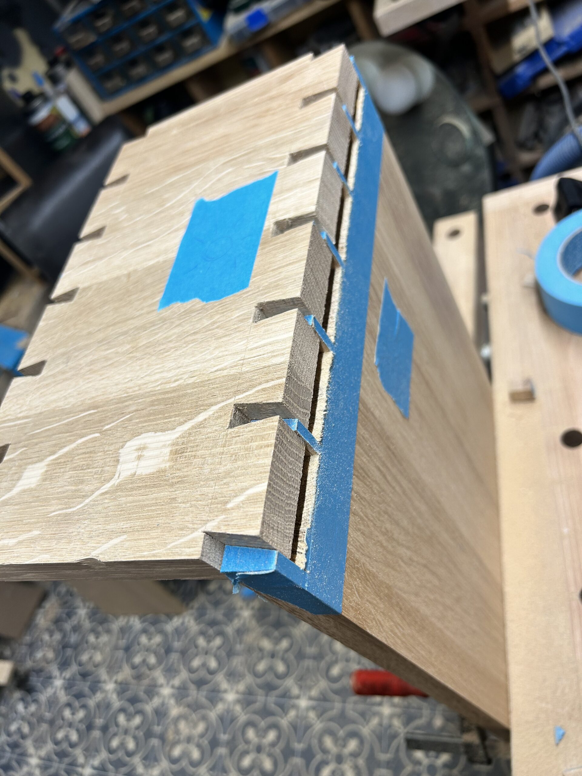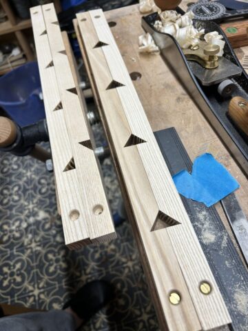 Ich habe Kumiko für die Füllung der Tür benutzt. Für die größeren Flächen (Schrank Rückwand und die Tür) habe ich Multiplex furniert. Es kam dabei das Saraifo Furnier zum Einsatz. Der Korpus wurde mit Schwalbenschwanzverbindungen versehen und die Tür mit Schlitz und Zapfen. Als kleines Gimmick habe ich auch eine japanische Verbindung hergestellt mit dem Namen “kama hozo kumi”. Dazu wurde ich von Dorian Bracht und seinem Buch inspiriert.