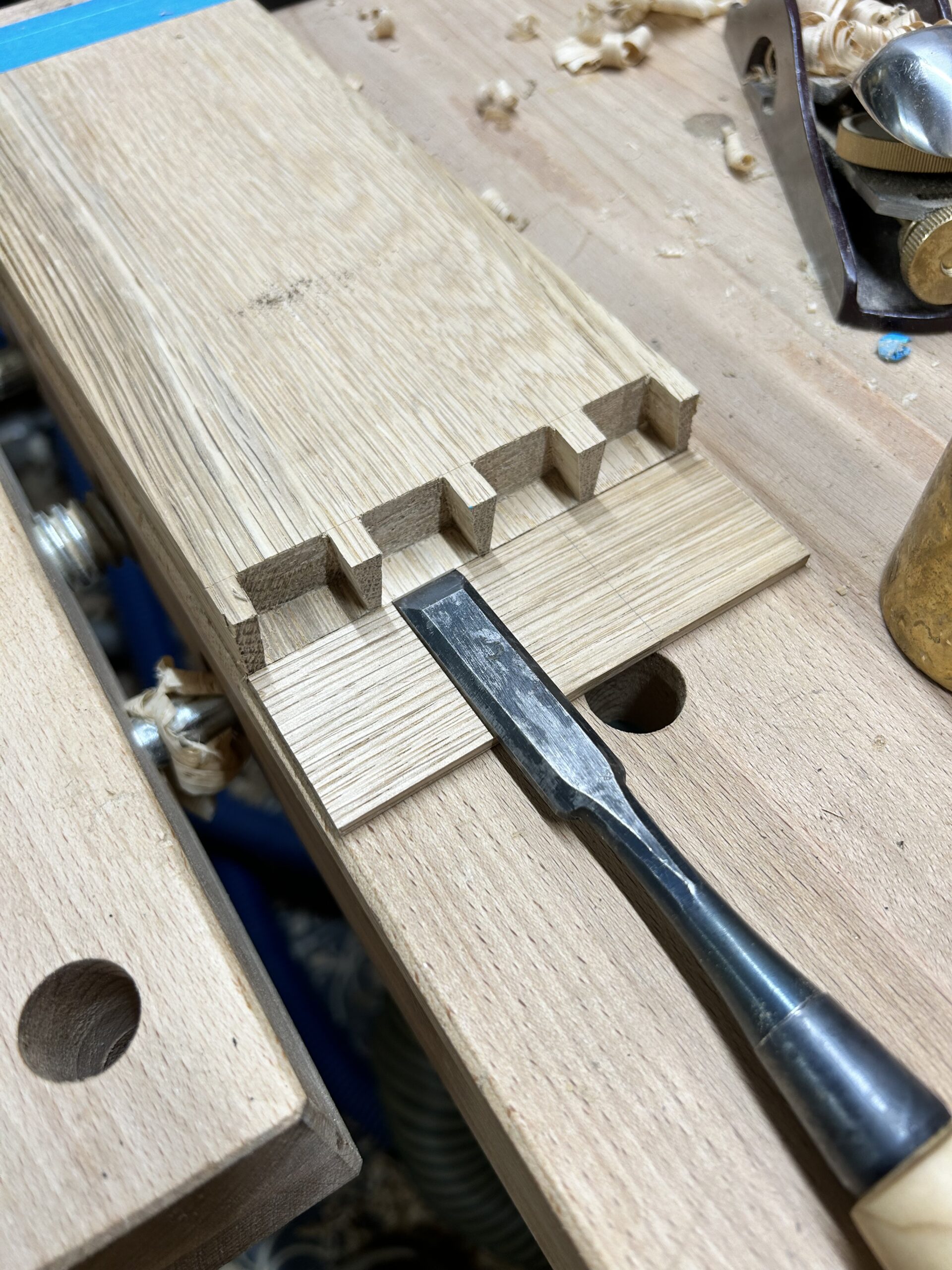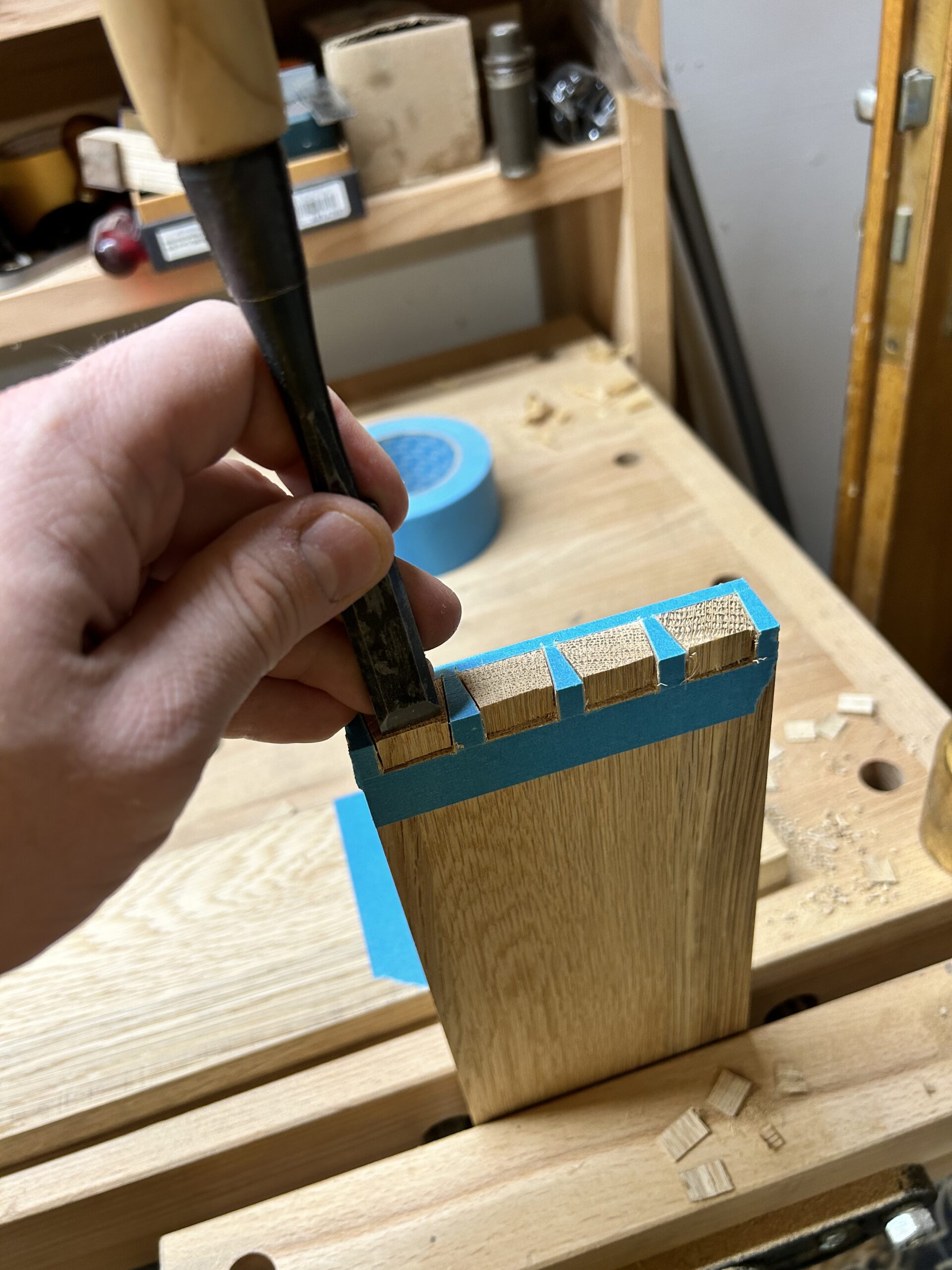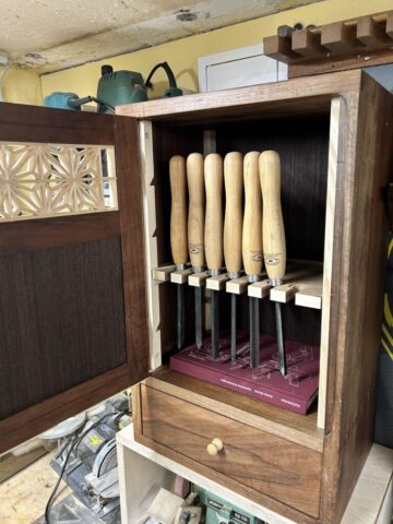 I built this little cabinet to learn various techniques using hand tools. I used Kumiko for the door panel. For the larger surfaces (the cabinet back and the door), I used veneered plywood with Saraifo veneer. The carcass features dovetail joints, and the door is joined with mortise and tenon. As a small extra, I also incorporated a Japanese joint called “kama hozo kumi”, inspired by Dorian Bracht and his book.